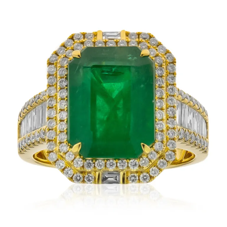Gönnen Sie sich den Luxus dieses prächtigen Rings aus 18 Karat Gelbgold, der einen atemberaubenden sambischen AAA-Smaragd im Oktagon-Schliff von 10,33 Karat präsentiert. Der leuchtend grüne Edelstein wird von 0,738 ct eleganten Diamanten im Baguetteschliff und 0,847 ct funkelnden Steinen im runden Brillantschliff umrahmt, die zusammen ein Gesamtkaratgewicht von 11,915 ct ergeben. Dieser beeindruckende Ring eignet sich perfekt für Galaveranstaltungen und bedeutende Anlässe und vervollständigt ein elegantes Ensemble mit einem Hauch von königlicher Raffinesse.