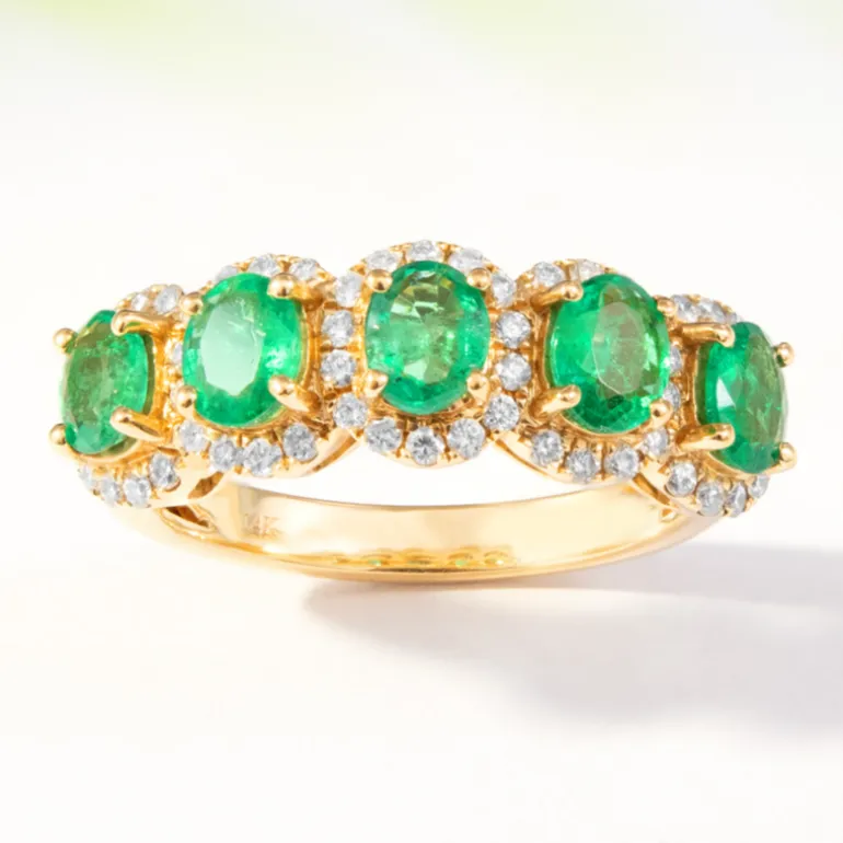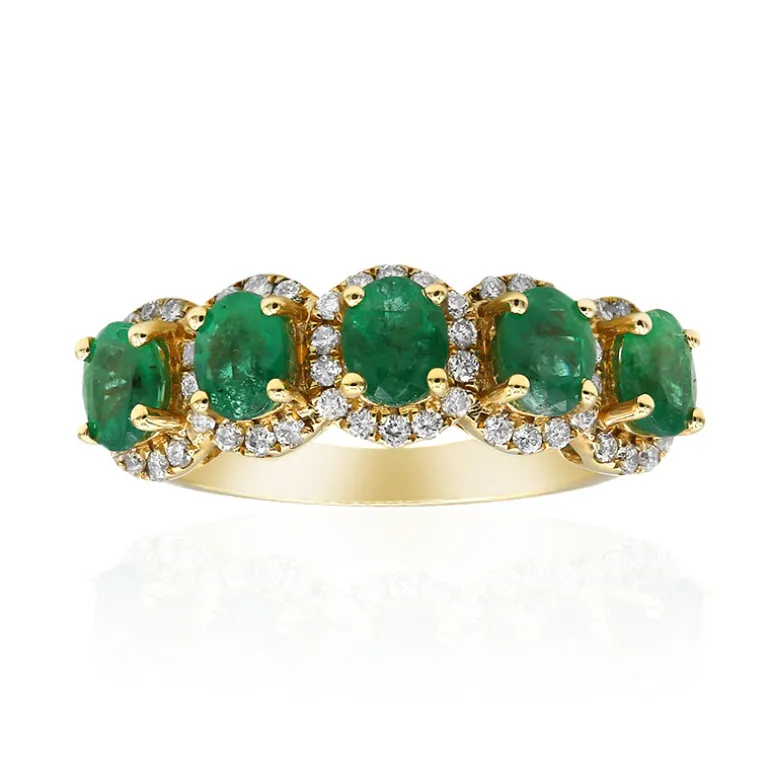 Dieser Ring aus 14-karätigem Gelbgold enthüllt ein Meisterwerk: Fünf AAA-Smaragde aus Sambia sind in einem eleganten Oval gefasst und werden von 54 schimmernden SI1-Diamanten von insgesamt 0,43 Karat ergänzt. Die 1,54 Karat schweren Smaragde strahlen in einem auffälligen Grünton und sind so gearbeitet, dass sie das Licht aus jedem Winkel einfangen. Dieser luxuriöse Ring eignet sich sowohl für den eleganten Tag als auch für den eleganten Abend und ist die ideale Wahl für anspruchsvolle Anlässe und eine exquisite Ergänzung für jede Schmucksammlung.