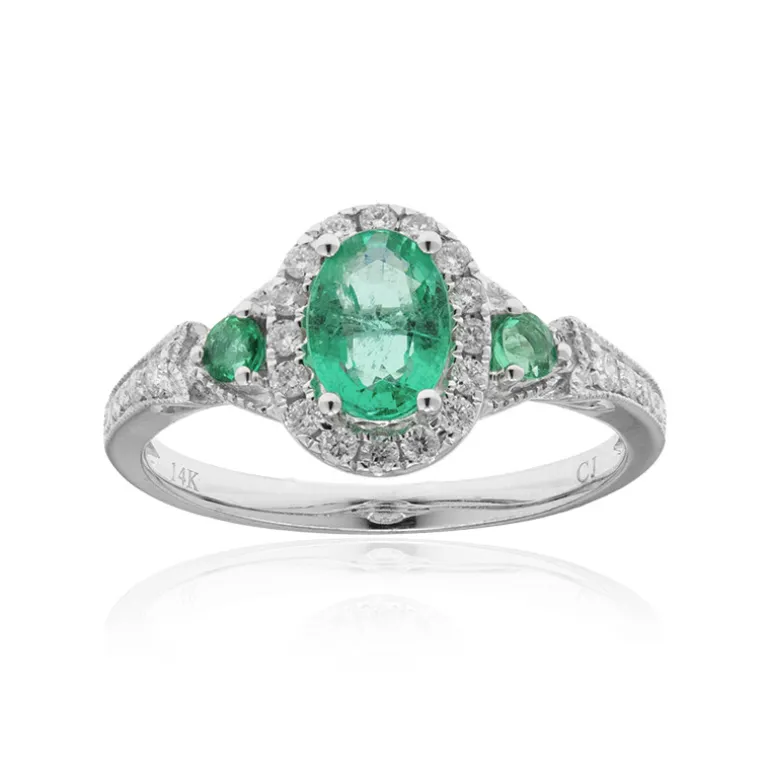 Entdecken Sie die Faszination unseres raffinierten sambischen Smaragdrings mit einem 0,708 Karat schweren Mittelstein im eleganten Ovalschliff, der von zwei Smaragden im Rundschliff und einem Kranz funkelnder SI2-Diamanten von insgesamt 0,236 Karat eingerahmt wird. Dieses Meisterwerk wurde sorgfältig aus hochwertigem 14 Karat Weißgold gefertigt und bietet zeitlosen Luxus mit einem Gesamtkaratgewicht von 1,065 Karat. Dieser Ring eignet sich perfekt für besondere Anlässe oder als raffinierter Akzent für Ihr Alltagsoutfit und ist ein wertvoller Bestandteil Ihrer Sammlung.