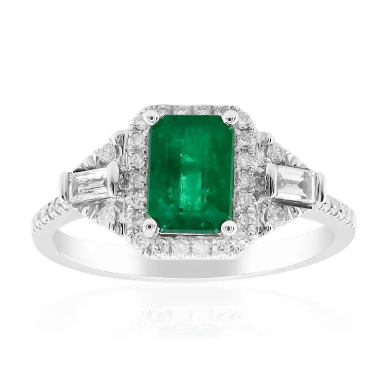 Dieser atemberaubende Ring präsentiert einen lebhaften Sambia-Smaragd im Oktagon-Schliff von 0,91 Karat, flankiert von 2 Diamanten im SI2-Baguetteschliff und umgeben von 38 Diamanten im Brillantschliff, alles in glänzendem 585er Weißgold. Er eignet sich perfekt für besondere Anlässe und ergänzt elegante Abendgarderobe auf exquisite Weise. Ein Schatz für Edelsteinliebhaber, der Luxus und Raffinesse mühelos miteinander verbindet.