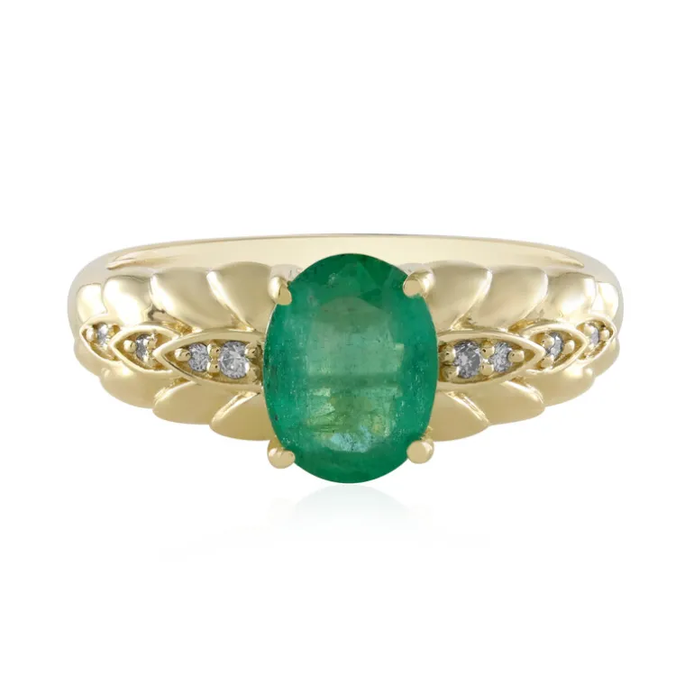 Entdecken Sie die luxuriöse Anziehungskraft dieses Goldrings mit einem exquisiten AAA-Smaragd aus Sambia, der fachmännisch in ein 8 x 6 mm großes Oval geschliffen wurde. Begleitet von funkelnden I2 (H) Diamanten, strahlt dieses Stück aus 585er Gelbgold mit einem Gesamtkaratgewicht von 1,17 ct Eleganz aus. Er eignet sich perfekt für Abendveranstaltungen oder raffinierte Zusammenkünfte und verleiht jedem Outfit Eleganz, sodass Sie mühelos glänzen.
