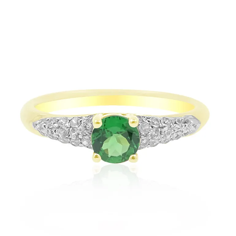Entdecken Sie die Eleganz dieses Tsavorit-Goldrings mit einem 0,45-karätigen Edelstein im Rundschliff aus Tansania. Akzentuiert durch funkelnde kambodschanische Zirkone hat dieses Stück ein Gesamtkaratgewicht von 0,733 Karat. Das Schmuckstück aus 9-karätigem Gold eignet sich perfekt für besondere Anlässe oder einen Hauch von Eleganz im Alltag. Kombinieren Sie es mit einem eleganten Abendkleid oder Ihrer Lieblingsbluse für einen raffinierten Look.
