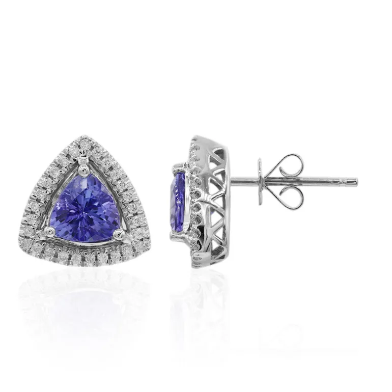 Entdecken Sie die Faszination Tansanias mit diesen prächtigen Ohrringen aus 10 Karat Weißgold, die 1,41 Karat Tansanit im AAA-Trillant-Schliff in einem eleganten Design präsentieren. Die 54 Diamanten der Reinheitsklasse I1 fügen den mystischen Blautönen einen funkelnden Heiligenschein hinzu und machen diese Ohrringe zu einer raffinierten Wahl für besondere Anlässe oder um Ihrer Alltagsgarderobe einen Hauch von Luxus zu verleihen. Lassen Sie diese kostbaren Edelsteine mit einem Gesamtkaratgewicht von 1,56 ct zu Ihrem bevorzugten Accessoire werden, das Ihnen ein raffiniertes Finish verleiht.