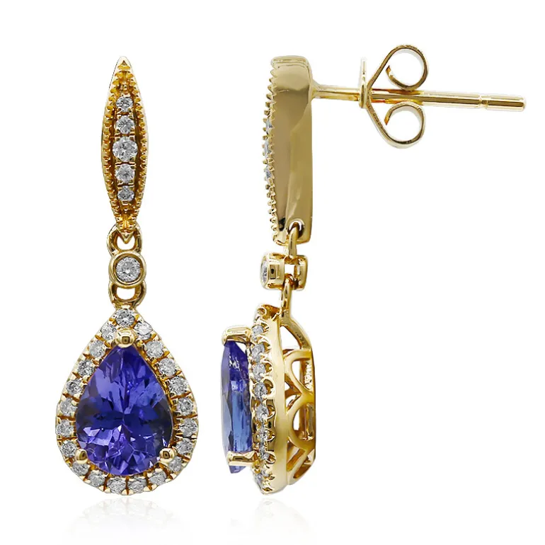 Diese luxuriösen Ohrringe aus 14-karätigem Gelbgold sind mit 1,39 Karat AAA-Tansaniten aus Tansania im verführerischen Tropfenschliff besetzt. Ergänzt durch 54 Diamanten SI2 (H) von insgesamt 0,21 ct. verfügen diese Ohrringe über einen runden Brillantschliff, der bei jeder Bewegung funkelt. Die elegante Länge von 23 mm sorgt für einen souveränen Look bei Abendveranstaltungen oder wichtigen Anlässen. Das Gesamtkaratgewicht von 1,6 ct sorgt für ein kühnes, aber raffiniertes Statement.