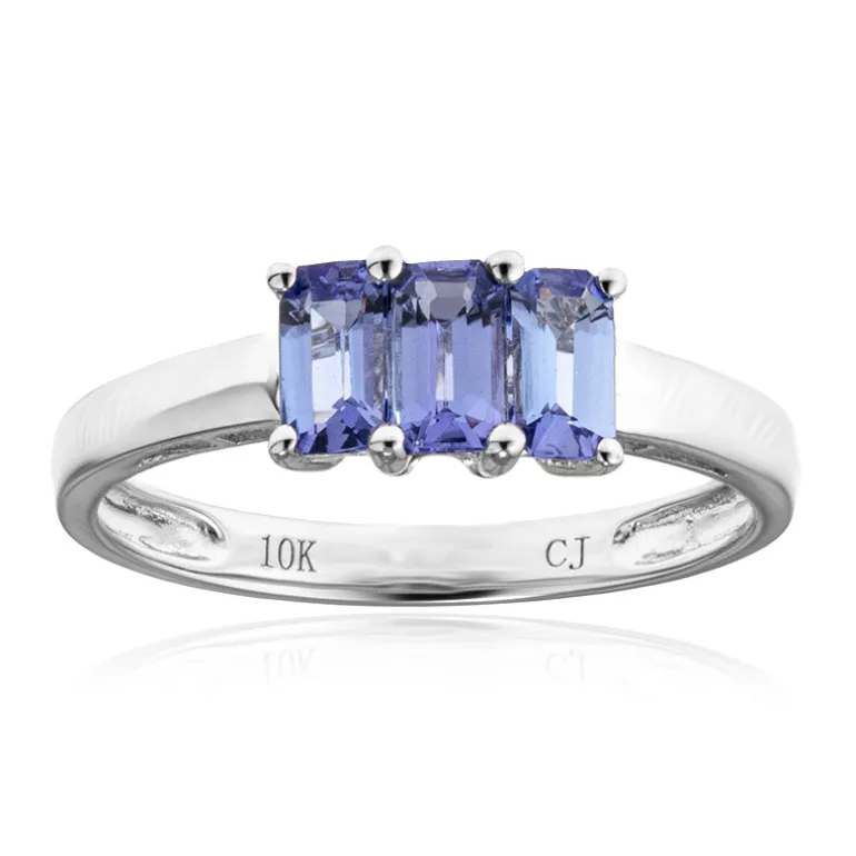 Eine atemberaubende Dreifaltigkeit von AAA-Tansanit-Edelsteinen, die elegant in 10 Karat Weißgold gefasst sind, macht diesen Ring zu einer raffinierten Ergänzung für jede Schmucksammlung. Die aus den üppigen Landschaften Tansanias stammenden Edelsteine mit einem Gesamtgewicht von 0,797 Karat weisen den begehrten achteckigen Smaragdschliff auf und messen jeweils etwa 5×3 mm. Dieser 23×20 mm große Ring mit seinen ruhigen Blautönen und dem schlanken Band ist ideal für Freizeitkleidung und formelle Anlässe und passt zu einer Vielzahl von Outfits und Gelegenheiten.
