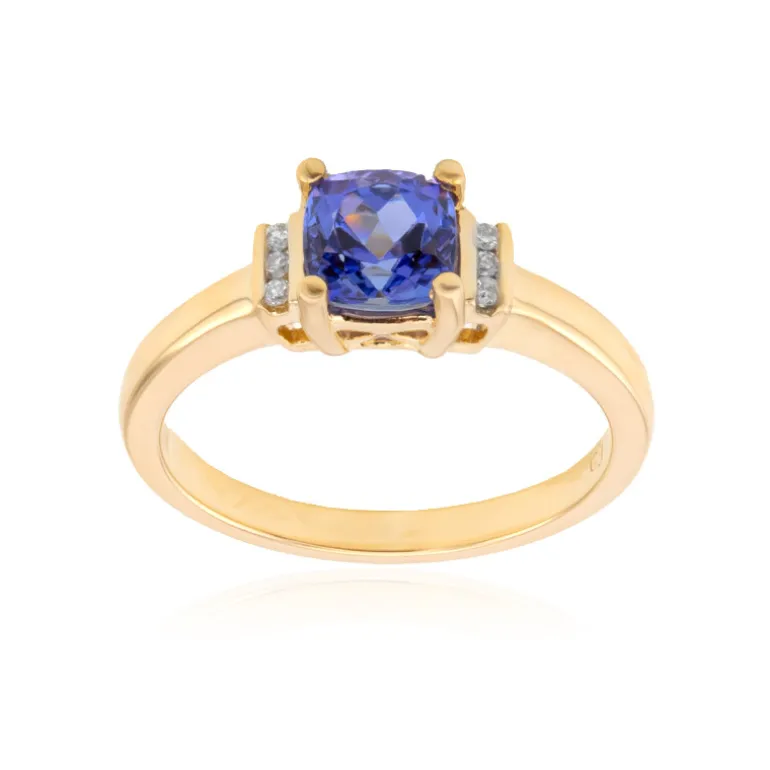 Genießen Sie den königlichen Glanz dieses atemberaubenden Rings aus 10 Karat Gelbgold, der einen faszinierenden Tansanit im Kissenschliff von 1,03 Karat aus den reichen Minen Tansanias präsentiert. Der zentrale Edelstein wird von sechs Diamanten der Reinheit I1 flankiert, die den Charme des Rings noch verstärken. Mit einem Gesamtkaratgewicht von 1,07 Karat bietet dieser Ring ein klassisches, antik inspiriertes Design. Der 6 mm große Tansanit schimmert in tiefblauen Tönen und ist ein bezauberndes Accessoire für formelle Anlässe oder ein luxuriöses Accessoire für das tägliche Tragen.