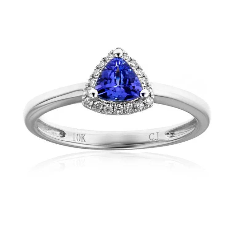 Entdecken Sie die fesselnde Anziehungskraft dieses 0,408ct AAA Tansanit Rings, der aus dem Herzen Tansanias stammt. Der aus 10 Karat Weißgold gefertigte Tansanit im Trillant-Schliff strahlt in einem leuchtenden Blauton, der von einem Kranz aus 18 funkelnden I1 (H) Diamanten von insgesamt 0,089 Karat akzentuiert wird. Das schlanke Design des Rings mit den Maßen 25 x 20 mm wirkt modern und zeitlos zugleich und ist ideal, um sowohl der Tages- als auch der Abendgarderobe Eleganz zu verleihen. Mit einem Gewicht von ca. 1,91 g ist der Ring ein schweres, aber bequemes Stück. Dieser Ring eignet sich perfekt für Feierlichkeiten oder als bemerkenswertes Geschenk und wird über Jahre hinweg geschätzt werden.