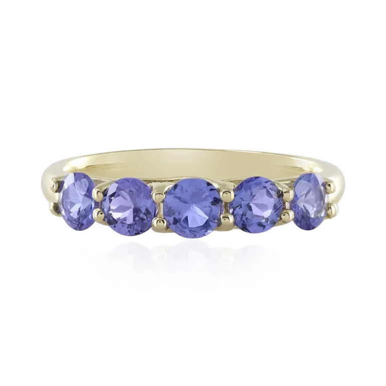 Entdecken Sie den Glanz tansanischer Tansanite in diesem Ring aus 9-karätigem Gold, in dem fünf AAA-Tansanite im Rundschliff mit insgesamt 1,35 Karat elegant Ihren Finger schmücken. Jeder Edelstein misst etwa 4 mm und ist in glänzendes Gold mit einem Gewicht von etwa 1,63 Gramm gefasst, das die Blicke auf sich zieht. Er eignet sich perfekt, um Ihrem Ensemble einen Hauch von Eleganz zu verleihen, und lässt sich mühelos vom Tag in den Abend verwandeln, was ihn zu einer idealen Wahl für legere und formelle Anlässe macht.