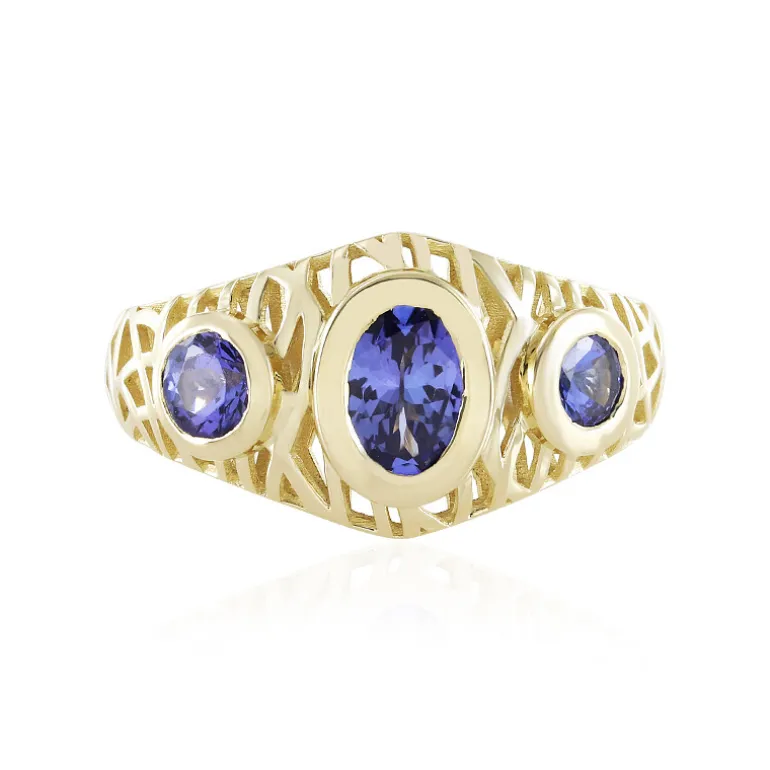 Entdecken Sie die luxuriöse Anziehungskraft dieses Rings aus 9 Karat Gelbgold, der mit einem AAA-Tansanit aus Tansania geschmückt ist. Der zentrale Edelstein im Ovalschliff mit einem Gewicht von 0,765 ct wird von zwei Tansaniten im Rundschliff mit einem Gesamtgewicht von 0,54 ct ergänzt, die jeweils sorgfältig aufgrund ihres tief blau-violetten Farbtons und ihrer Brillanz ausgewählt wurden. Das elegante, durchbrochene Design mit einem Gesamtgewicht von 1,31 ct verstärkt den Charme des Rings. Er eignet sich perfekt für besondere Anlässe und verleiht Ihrer Abendgarderobe einen Hauch von Raffinesse oder kann als auffälliges Accessoire für den Alltag dienen.