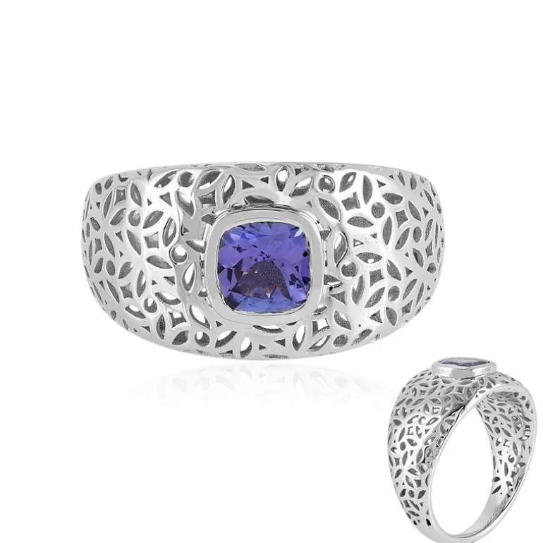 Entdecken Sie die Faszination dieses raffinierten Rings aus 375er Weißgold, der einen exquisiten Tansanit von 0,99 Karat aus den sonnenverwöhnten Ebenen Tansanias in sich birgt. Der antike Kissenschliff des Edelsteins wird durch das komplizierte, blattähnliche Gitterwerk vergrößert, das das Band schmückt und eine einzigartige Mischung aus antiker Eleganz und moderner Handwerkskunst widerspiegelt. Mit diesem Ring unterstreichen Sie Ihren raffinierten Geschmack, der sich sowohl für formelle Anlässe als auch für den täglichen Luxus eignet.