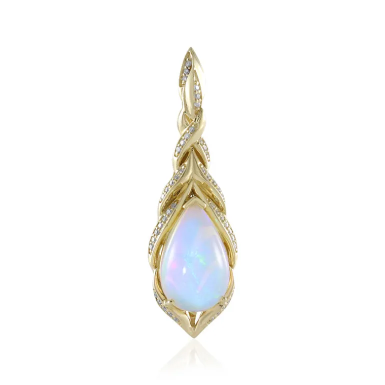 Dieser exquisite Anhänger zeigt einen AAA Welo Opal aus Äthiopien, der in 585er Gelbgold gefasst ist. Der opalisierende Edelstein, der in einem tropfenförmigen Cabochon geschliffen ist, wird von 47 runden Diamanten im Brillantschliff ergänzt, die ihm Glanz und Eleganz verleihen. Er eignet sich sowohl für formelle Anlässe als auch für den Alltag und kann mit einem eleganten Kleid oder einer schicken Bluse kombiniert werden, um Ihren Stil zu unterstreichen.