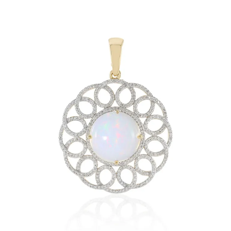 Entdecken Sie die Anziehungskraft dieses bezaubernden Anhängers aus 14 Karat Gelbgold mit einem faszinierenden Welo-Opal der Güteklasse AAA aus Äthiopien mit einem Gesamtkaratgewicht von 5,26ct. Eingerahmt von 328 funkelnden Diamanten der Reinheit SI2 mit einem Gesamtgewicht von 0,837 ct, fängt dieses Schmuckstück bei jeder Bewegung Licht und Aufmerksamkeit ein. Das verschlungene, kreisförmige Muster bringt das Farbspiel des Opals zur Geltung und ist ideal für besondere Anlässe oder als raffiniertes Accessoire für den Alltag. Mit einem Varioclip versehen, ist er anpassungsfähig und passt zu jeder Kette und jedem Kleidungsstück.