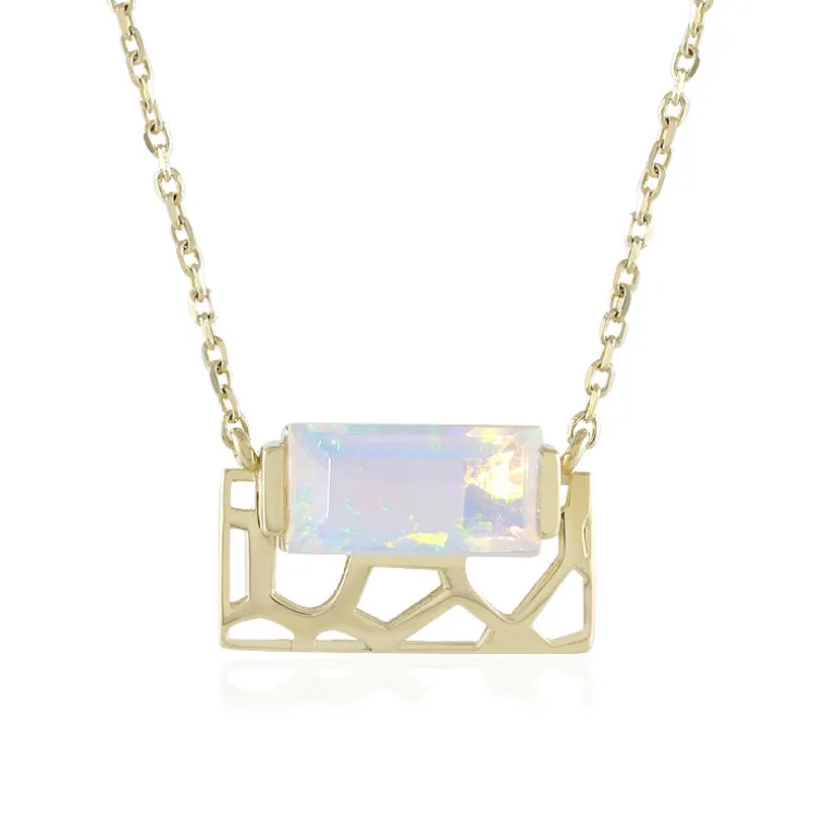 Entdecken Sie die fesselnde Schönheit des äthiopischen Welo-Opals in elegantem 9-karätigem Gelbgold. Diese Halskette enthält einen Opal im Baguetteschliff von 0,63 Karat, der ein bezauberndes Farbenspiel zeigt. Der Anhänger misst 7×12 mm und hängt an einer Kette, die von 45,5-50,5 cm verstellbar ist. Dieses Schmuckstück ist perfekt, um Ihrer Abendgarderobe einen Hauch von Eleganz zu verleihen, und passt zu formellen und legeren Outfits gleichermaßen.