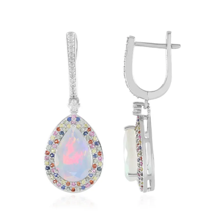 Entdecken Sie den schillernden Charme dieser lebhaften Ohrringe mit 2,772 ct äthiopischen Welo-Opalen im fesselnden Tränenschliff. Umgeben von einem verspielten Medley aus 158 Edelsteinen – darunter funkelnde Zirkone aus Kambodscha -, die alle in glänzendes 9-karätiges Gold gefasst sind, wiegen diese Ohrringe ca. 5,46 g. Mit einer Länge von 33 mm setzen sie ein Zeichen von Raffinesse und Eleganz. Sie eignen sich perfekt, um einem formellen Ensemble einen farblichen Akzent zu verleihen oder einen schicken Alltagslook aufzuwerten.