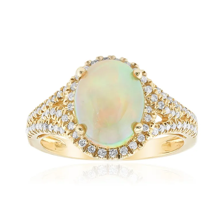 Erleben Sie die Faszination des AAA Welo Opal-Diamant-Goldrings, der sorgfältig aus 14 Karat Gelbgold gefertigt wurde. Sein Herzstück ist ein faszinierender ovaler Opal aus Äthiopien mit einem Cabochon von 1,82 Karat, umgeben von 0,288 Karat SI2-Diamanten im runden Brillantschliff. Dieses exquisite Schmuckstück eignet sich perfekt für elegante Abende und besondere Anlässe. Es ergänzt sowohl formelle als auch schicke Outfits mühelos und verleiht Ihrem Ensemble einen Hauch von Opulenz.