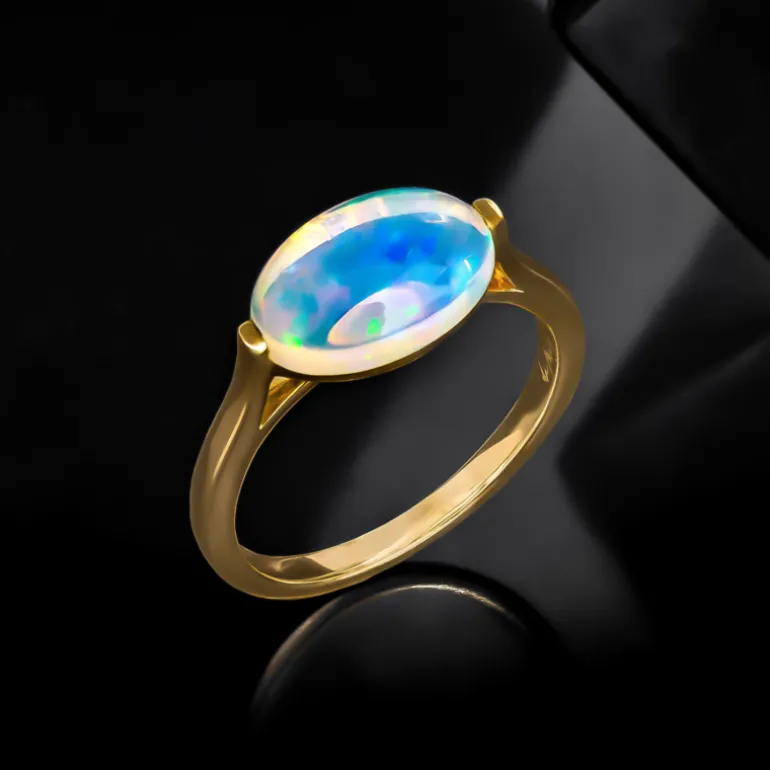 Entdecken Sie das bezaubernde Farbenspiel dieses Rings aus äthiopischem Welo-Opal (AAA), der aus 2,53 g warmem 9-karätigem Gold gefertigt ist. Der ovale Cabochon-Opal mit einem Gewicht von 1,44 Karat zeigt ein exquisites Spektrum an Farbtönen. Sein minimalistisches Design strahlt Raffinesse aus und ist perfekt geeignet, um sowohl der Tages- als auch der Abendgarderobe einen Hauch von Eleganz zu verleihen. Ideal für Liebhaber seltener Edelsteine, die ein vielseitiges Accessoire suchen.