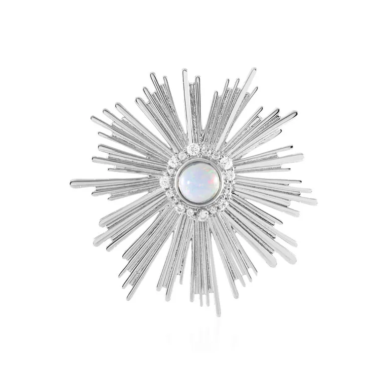 Dieser strahlende Anhänger ist eine Verkörperung himmlischen Charmes, mit einem zentralen AAA Welo Opal aus Äthiopien, der von einer Reihe glitzernder Zirkone aus Kambodscha umgeben ist. Der runde Cabochon-Opal von 0,948 Karat dient als leuchtender Mittelpunkt, umgeben vom Funkeln der Zirkone von insgesamt ca. 0,688 Karat, die harmonisch in das komplizierte Starburst-Design eingefügt sind. Der Anhänger aus platiniertem 925er Sterlingsilber ist 50 x 48 mm groß und passt sowohl zu formellen als auch zu legeren Anlässen.