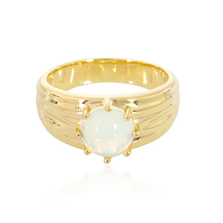 Entdecken Sie die bezaubernde Anziehungskraft unseres vergoldeten Rings aus Sterlingsilber, hervorgehoben durch die himmlische Schönheit eines runden Cabochons von 1,08 Karat AAA Welo Opal aus Äthiopien. Mit einer Größe von etwa 8 mm ist dieser Edelstein ein Spektakel schillernder Farben. Das 925er Sterlingsilberband mit seiner großzügigen Vergoldung und einem Gewicht von ca. 6,75 g bietet eine perfekte Bühne für das Farbenspiel des Opals. Mit seinem zeitlosen Charme ist dieses Schmuckstück ideal für anspruchsvolle Anlässe oder als eleganter Akzent für den Alltag.