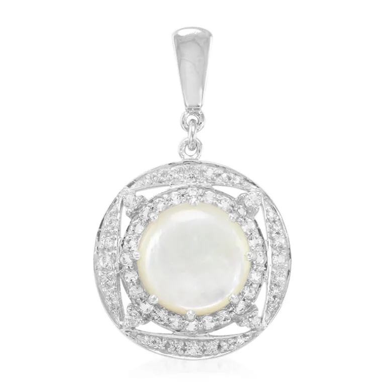 Entdecken Sie den bezaubernden Charme dieses sorgfältig gefertigten Anhängers mit einem atemberaubenden runden Cabochon aus australischer Abalone-Muschel von 5,25 Karat, umgeben von einem Halo aus funkelnden brasilianischen weißen Topasen von insgesamt 1,14 Karat. Der Anhänger ist aus 925er Sterlingsilber gefertigt und strahlt Raffinesse aus. Das raffinierte Design und die schimmernden Edelsteine machen ihn zu einem vielseitigen Accessoire, das sowohl die Tagesgarderobe aufwertet als auch der Abendgarderobe einen eleganten Touch verleiht.