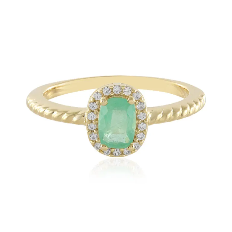 Ein Schatz aus dem Herzen Äthiopiens: Dieser exquisite Ring enthält einen Smaragd von 0,909 Karat, der klassisch geschliffen wurde, um seinen üppigen grünen Farbton zur Geltung zu bringen. Umgeben von 0,214 ct funkelnden kambodschanischen Zirkonen und gefasst in 925er Sterlingsilber mit eleganter Goldplattierung, wiegt dieses Stück etwa 2,6 g. Mit einer perfekten Größe von 24×21 mm passt das zeitlose Design sowohl zu legeren als auch zu formellen Outfits und ist somit ein ideales Accessoire für jeden Anlass.