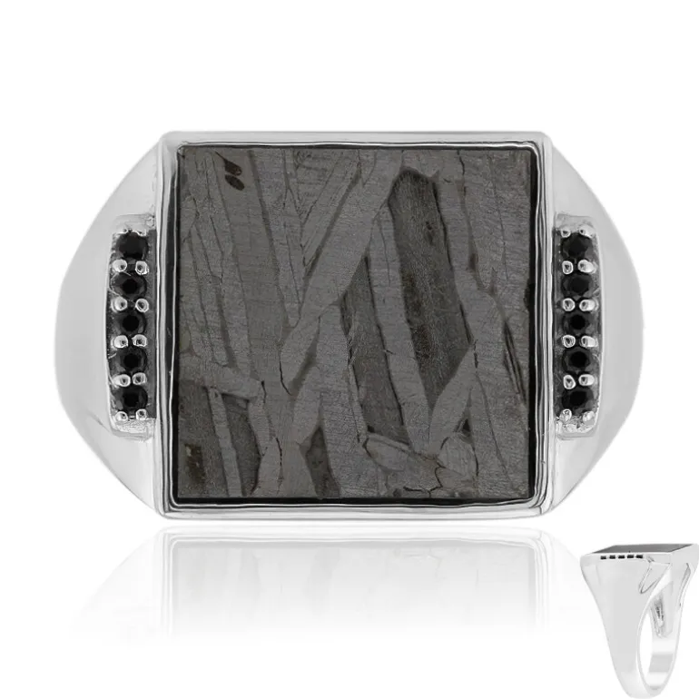 Entdecken Sie die Anziehungskraft des Kosmos mit diesem auffälligen Aletai-Meteoriten-Silberring. Mit einem Meteoriten im Carré-Schliff von 2,831 Karat aus China, der von zehn runden schwarzen Spinellen ergänzt wird, bietet dieses Schmuckstück eine einzigartige Mischung aus Naturwundern. Der aus 925er Sterlingsilber gefertigte Ring eignet sich perfekt für jedes elegante Ensemble oder als Schmuckstück für besondere Anlässe. Lassen Sie sich von der Eleganz der Geheimnisse des Universums verzaubern.