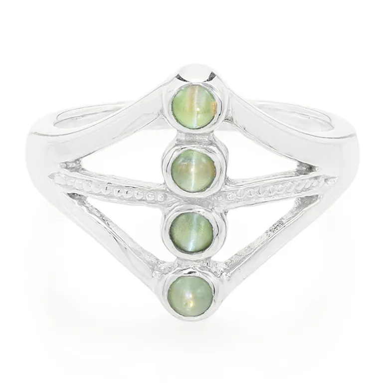 Dieser schicke indische Katzenaugen-Alexandrit-Ring verleiht jedem Ensemble einen faszinierenden Touch und besticht durch seinen einzigartigen Charme. Der aus glänzendem 925er Sterlingsilber gefertigte Ring enthält vier runde Alexandrit-Cabochons von zusammen 0,31 Karat, die in einem faszinierenden geometrischen Muster gefasst sind, das moderne Eleganz ausstrahlt. Das Lichtspiel, das durch den Katzenaugeneffekt jedes Edelsteins entsteht, sorgt bei jeder Bewegung für ein fesselndes Schimmern. Ideal für den Übergang von Tag zu Abend und für besondere Anlässe. Kombinieren Sie ihn mit Ihrem Lieblingscocktailkleid oder einem klassischen Business-Anzug für einen zusätzlichen Hauch von Raffinesse.