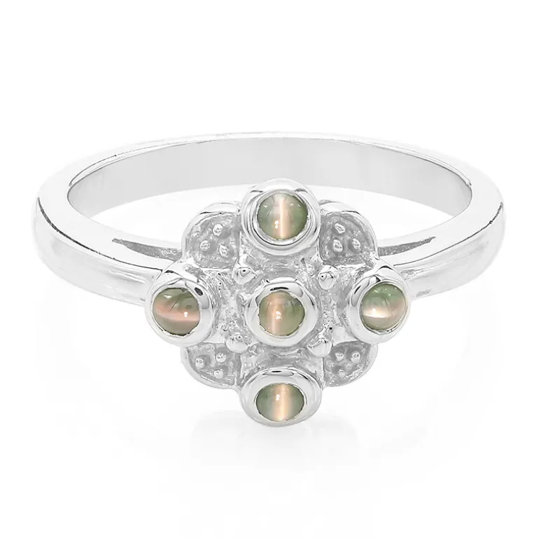 Dieser bezaubernde Ring zeigt die mystische Anziehungskraft der indischen Alexandrit-Katzenaugen-Edelsteine mit insgesamt 0,21 Karat. Sie sind elegant in ein 925er Sterling Silberband gefasst, das jeden runden Cabochon bei jeder Bewegung schimmern lässt. Die Besonderheit des Katzenaugeneffekts sorgt für ein fesselndes visuelles Interesse und macht ihn zu einem Gesprächsanlass auf jeder Veranstaltung. Ideal, um einem Business-Outfit einen Hauch von Klasse zu verleihen oder ein Abendkleid dezent zum Funkeln zu bringen. Ein vielseitiges Accessoire für alle, die die feinen Details in Schmuck schätzen.