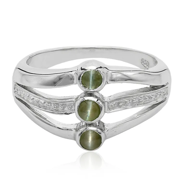 Entdecken Sie die Anziehungskraft des indischen Katzenaugen-Alexandriten in diesem glänzenden Ring aus 925er Sterlingsilber. Dieses edle Stück enthält 3 runde Cabochon-Edelsteine von insgesamt 0,32 Karat, die für ihre bezaubernden Farbwechsel-Eigenschaften bekannt sind. Das Design erstreckt sich über 23,5 x 21,5 mm und ist ein elegantes, modernes Statement. Es ist eine raffinierte Wahl sowohl für den Tag als auch für den Abend und verleiht Ihrer Kleidung einen Hauch von Geheimnis.