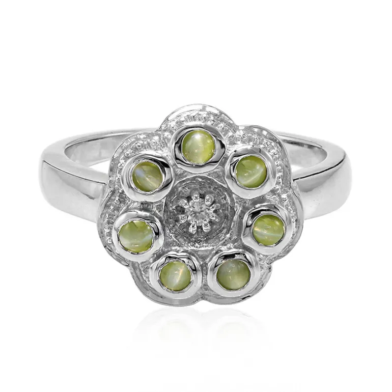 Entdecken Sie die fesselnde Anziehungskraft dieses Rings aus Sterlingsilber, der ein einzigartiges Ensemble aus sieben indischen Katzenaugen-Alexandriten im runden Cabochon-Schliff mit einem Gesamtgewicht von 0,39 ct präsentiert. Jeder Edelstein wird durch einen brillanten kambodschanischen Zirkon in der Mitte ergänzt, der die strukturierte florale Silhouette von 23,5 x 20,5 mm zum Funkeln bringt. Mit einem Gewicht von ca. 3,31 g ist dieses Stück aus Sterlingsilber eine Verkörperung von Eleganz. Es ist ideal, um jedem Outfit einen Hauch von Raffinesse zu verleihen und eignet sich sowohl für besondere Anlässe als auch für den Alltag.