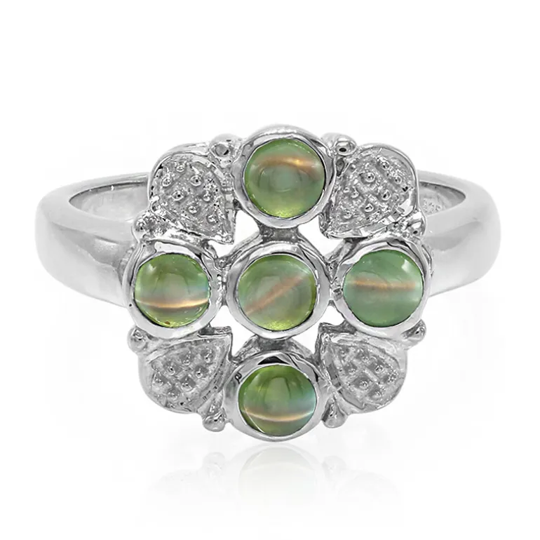 Lassen Sie sich von der mystischen Anziehungskraft dieses bezaubernden Rings aus Sterlingsilber verzaubern, der fünf fesselnde Katzenaugen-Alexandrit-Edelsteine aus Indien enthält, von denen jeder kunstvoll in eine runde Cabochon-Form geschliffen ist. Die Steine haben zusammen ein Gewicht von 0,93 Karat und sind harmonisch in das polierte 925er Sterlingsilber eingefasst. Das Gesamtgewicht beträgt ca. 3,79 Gramm. Mit einer Größe von 23,5 x 21 mm ist dieser Ring mit seiner schlanken Form und den changierenden Grüntönen der Edelsteine ein vielseitiges Accessoire, das sowohl tagsüber elegant als auch abends charmant ist. Perfekt für besondere Momente, die einen Hauch von Raffinesse und Faszination erfordern.