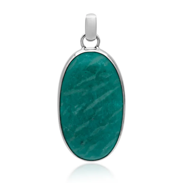 Entdecken Sie die ruhige Schönheit dieses 33-karätigen Anhängers aus russischem Amazonit mit einem großen ovalen Cabochon, der in poliertes, platiniertes Sterlingsilber gefasst ist. Der natürliche, feine meergrüne Farbton strahlt Ruhe aus und macht ihn zu einer fesselnden Ergänzung für jede Kleidung. Die faszinierende Qualität des Edelsteins, gepaart mit dem kühlen Glanz des Sterlingsilbers, verleiht sowohl legeren als auch formellen Ensembles einen erfrischenden Touch. Reservieren Sie dieses Schmuckstück für Momente, in denen ein dezentes, aber beeindruckendes Statement gefragt ist.