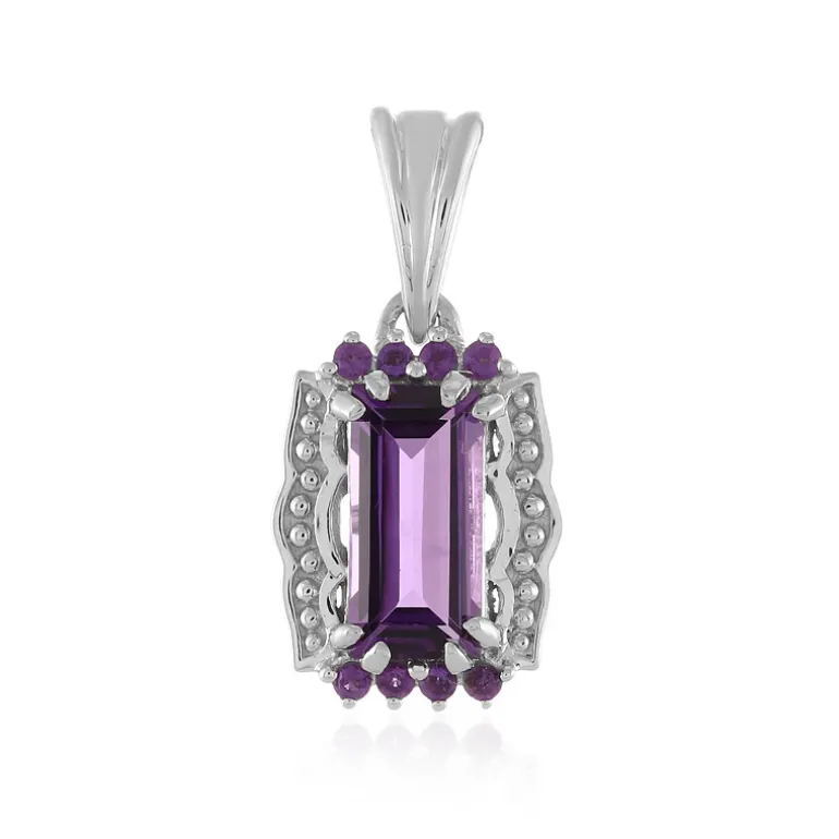 Entdecken Sie die Faszination dieses exquisiten Anhängers mit einem atemberaubenden brasilianischen Amethysten im Baguetteschliff von 1,355 Karat, umgeben von acht Amethysten im Rundschliff von insgesamt 0,113 Karat. Der Anhänger ist aus hochwertigem 925er Sterlingsilber gefertigt und hat ein Gesamtgewicht von 1,468 Karat. Mit einer Größe von 22×11 mm ist der Anhänger mit seinem königlichen violetten Farbton perfekt geeignet, um Ihrer Abendgarderobe einen Hauch von Eleganz zu verleihen oder Ihre Alltagskleidung aufzupeppen.