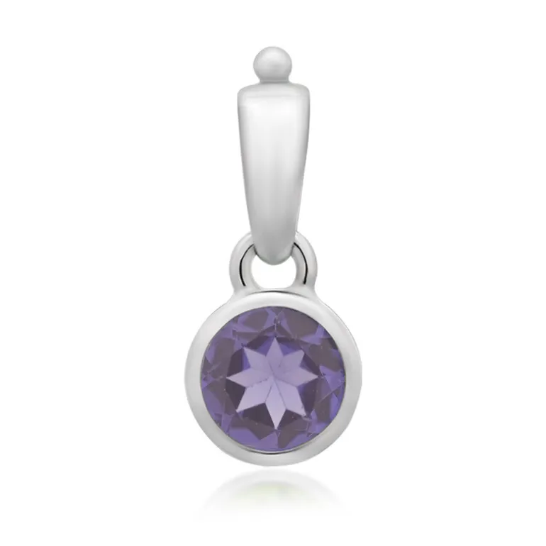 Entdecken Sie die Anziehungskraft dieses faszinierenden brasilianischen Amethyst-Anhängers, eines geschätzten Edelsteins, der für seine reichen violetten Farbtöne bekannt ist. Der Amethyst im Rundschliff mit einem Gewicht von 0,75 Karat ist in glänzendes 925er Sterlingsilber gefasst und mit einer Platinbeschichtung versehen, die für mehr Glanz und Haltbarkeit sorgt. Das schlanke Design und das Gewicht von ca. 1 g Silber machen den Anhänger zu einer raffinierten Wahl für jeden Tag und besondere Anlässe. Kombinieren Sie dieses elegante Stück mit einem Kaschmirpullover oder einem schicken Abendkleid, um Ihrem Ensemble einen Hauch von Raffinesse zu verleihen.
