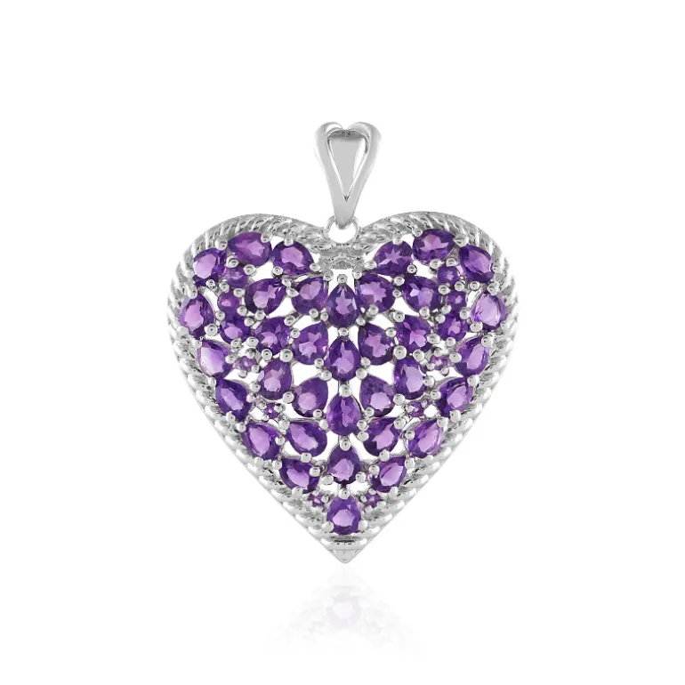 Dieser exquisite Anhänger hat die Form eines Herzens, das mit lebhaften brasilianischen Amethysten von insgesamt 5,31 Karat besetzt ist. Der 39×32 mm große Anhänger ist aus 925er Sterlingsilber gefertigt und setzt eine Reihe von runden und tropfenförmigen Edelsteinen in Szene. Dieses Schmuckstück eignet sich sowohl für elegante Abende als auch für den Alltag und verleiht jedem Outfit einen Hauch von Romantik und Raffinesse. Kombinieren Sie ihn mit einer schlichten Kette, um seine Brillanz zur Geltung zu bringen.