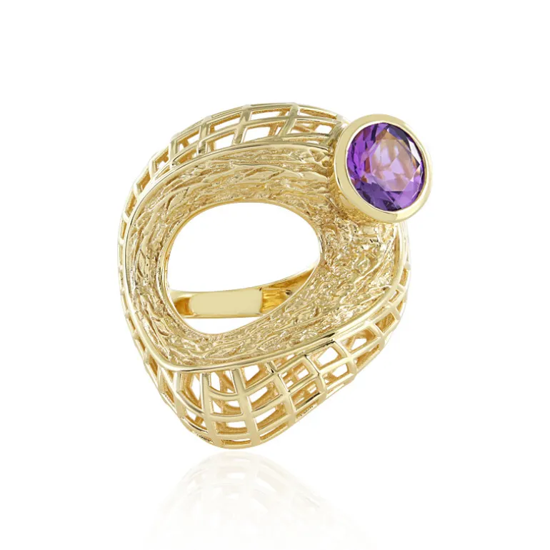 Dieser bezaubernde Ring aus der MONOSONO COLLECTION besticht durch einen brasilianischen Amethysten von 1,17 Karat im Rundschliff, gefasst in glänzend vergoldetem 925er Sterlingsilber. Das verschlungene, gitterartige Muster verleiht dem Ring ein modernes, architektonisches Flair, während der warme Glanz des Goldes den violetten Edelstein ergänzt. Dieser Ring eignet sich perfekt, um jedem Outfit einen Hauch von Raffinesse zu verleihen. Er glänzt bei gesellschaftlichen Anlässen oder als schillerndes Alltags-Accessoire.