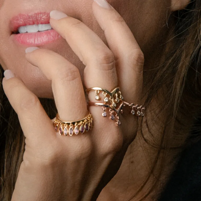 Dieser auffällige Ring besticht durch sein einzigartiges Design mit 5 brasilianischen Amethysten im Rundschliff von insgesamt 0,19 Karat, die anmutig an einem Band aus rosévergoldetem 925er Sterlingsilber baumeln. Mit einem Gewicht von ca. 3,1 Gramm präsentiert sich der Ring in einem modernen Stil, der sich sowohl für Freizeitkleidung als auch für elegante Anlässe eignet. Der Ring passt perfekt zu erdigen Tönen oder zu kräftigen Farben und verleiht jedem Outfit einen Hauch von lila Charme.