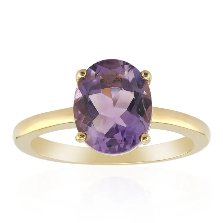 Entdecken Sie den verführerischen Charme dieses Rings aus vergoldetem 925er Sterlingsilber, gekrönt von einem faszinierenden brasilianischen Amethysten. Der ovale Edelstein mit einem Gewicht von 2,25 Karat wurde sorgfältig facettiert, um seine tief violetten Farbtöne zur Geltung zu bringen. Das schlichte, moderne Design unterstreicht die schlichte Eleganz des Rings und macht ihn zu einer vielseitigen Ergänzung Ihrer Accessoire-Kollektion. Ob bei einem legeren Brunch oder einer Abendgala, dieser Ring verleiht jedem Ensemble einen Hauch von Raffinesse.