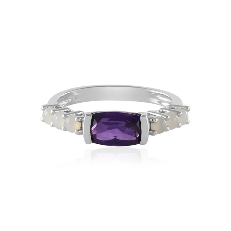 Entdecken Sie Eleganz mit diesem exquisiten brasilianischen Amethystring aus Sterlingsilber. Der Amethyst im Antikschliff, gepaart mit sechs indischen Mondsteinen, sorgt für ein fesselndes Strahlen. Er eignet sich perfekt für die Abendgarderobe oder als raffiniertes Accessoire für den Alltag. Mit seiner eleganten Silberfassung ist dieser Ring ein Zeugnis für raffinierten Geschmack und hochwertige Handwerkskunst, ideal für besondere Anlässe.