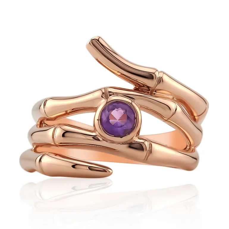 Entdecken Sie das Strahlen dieses Rings aus roséfarbenem 925er Sterlingsilber, der mit einem brasilianischen Amethysten im Rundschliff von insgesamt 0,21 Karat gekrönt ist. Sein einzigartiges Banddesign legt sich elegant um den Finger und spiegelt eine moderne Variante klassischer Raffinesse wider. Der sanfte Farbton der Rosévergoldung ergänzt den königlichen violetten Amethysten und macht ihn zu einem vielseitigen Schmuckstück für den Alltag oder besondere Anlässe. Kombinieren Sie dieses moderne Schmuckstück mit Pastell- oder Erdtönen, um seine warmen Nuancen zu betonen.