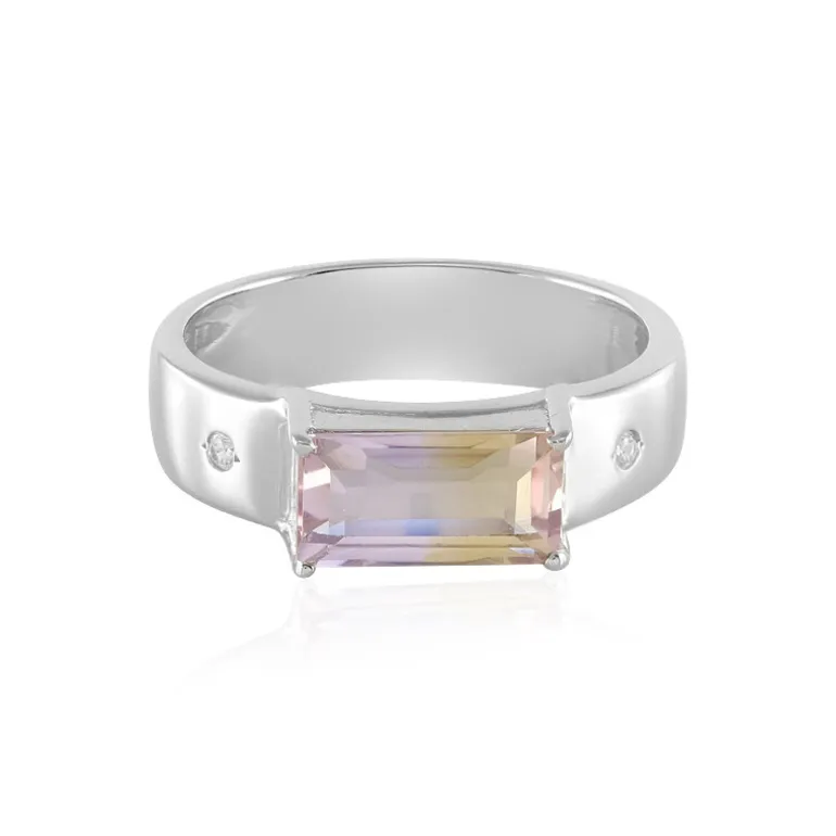 Dieser raffinierte Ring besticht durch einen Ametrin aus Bolivien, der im eleganten Baguetteschliff geschliffen ist, um seine einzigartigen violetten und gelben Farbtöne zur Geltung zu bringen. Der kunstvoll in platiniertes 925er Sterlingsilber gefasste 1,33-karätige Ametrin wird von zwei funkelnden Zirkon-Edelsteinen aus Kambodscha flankiert, die ihm einen zusätzlichen Hauch von Brillanz verleihen. Durch sein schlichtes Design eignet er sich sowohl für den eleganten Alltag als auch für besondere Anlässe und ergänzt jedes Outfit mit einem dezenten Farbtupfer.