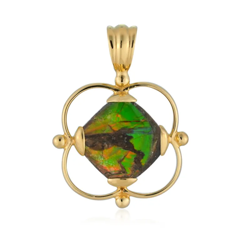 Dieser Anhänger präsentiert einen 5,5 Karat großen kanadischen Ammolithen im Cabochon-Schliff, der ein Kaleidoskop von Farben zeigt und einen lebendigen Schatz darstellt. Er ist in 925er Sterlingsilber mit einer eleganten Goldplattierung gehüllt und wiegt ca. 2,3 g. Er verkörpert die Essenz von Luxus. Er ist ideal, um sowohl im Alltag als auch bei besonderen Anlässen einen Farbtupfer zu setzen, und seine einzigartigen Farben sorgen dafür, dass er in jeder Schmucksammlung auffällt.