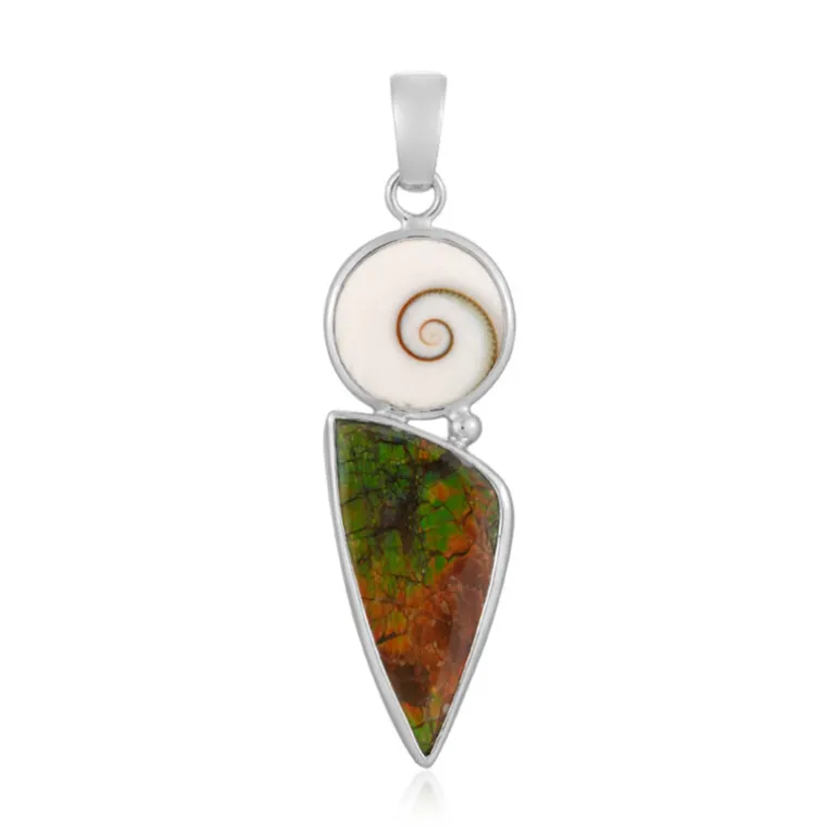 Entdecken Sie die lebendige Anziehungskraft dieses Anhängers mit zwei Steinen: einem 13-karätigen kanadischen Ammolithen mit einem faszinierenden Farbenspiel und einem 6,5-karätigen Shivaauge aus Indonesien. Gefertigt aus 925er Sterlingsilber mit Platin-Finish, strahlt dieses Schmuckstück eine natürliche Eleganz aus. Er eignet sich perfekt, um jedem Outfit einen Hauch von erdiger Raffinesse zu verleihen, und ist ein ideales Accessoire für von der Natur inspirierte Looks oder als Gesprächsanlass bei gesellschaftlichen Anlässen.