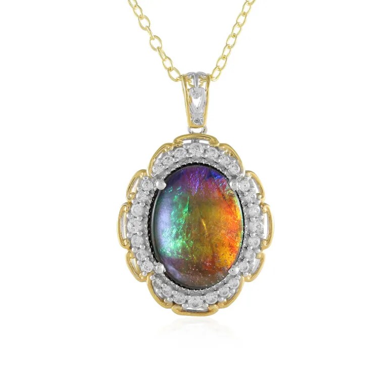 Enthüllen Sie Eleganz mit diesem Ammolith-Meisterwerk aus Kanada, das in einem exquisiten ovalen Cabochon präsentiert wird. Umgeben von funkelnden kambodschanischen Zirkonen strahlt diese Halskette Raffinesse aus. Mit einem Gesamtkaratgewicht von 6,885 ct ist es ein luxuriöses Statement. Sie eignet sich perfekt für die Abendgarderobe oder gehobene Anlässe und lässt sich wunderbar mit einem klassischen schwarzen Kleid oder einem maßgeschneiderten Anzug kombinieren.