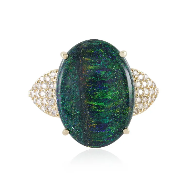 Entdecken Sie den Zauber des australischen Andamooka-Matrix-Opals in diesem atemberaubenden 585er Gelbgoldring. Mit einem ovalen Cabochon-Schliff, der die lebhaften Farbspiele und das 5,852 ct schwere Opalenfeuer hervorhebt, ist dieser Ring ein Meisterstück. Umgeben von insgesamt 48 Diamanten mit einem Gesamtgewicht von 0,310 ct, bietet dieses Schmuckstück Luxus und Eleganz. Tragen Sie es als prunkvolles Statement-Stück bei besonderen Anlässen oder als exquisiten Touch zu Ihrer eleganten Abendgarderobe.