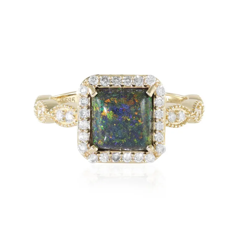 Entdecken Sie die Pracht des australischen Outbacks mit diesem bezaubernden Ring aus 14 Karat Gelbgold, der einen schillernden Andamooka Matrix Opal von 1,596 Karat präsentiert. Der Opal ist im klassischen Carré-Cabochon-Schliff gefasst und sein Farbenspiel wird durch das Funkeln von 36 Diamanten SI1 (H) von insgesamt 0,359 Karat ergänzt. Mit einem Gesamtgewicht von 1,955 Karat ist dieses Schmuckstück ein Zeugnis des Luxus. Das elegante Design passt sowohl zu formellen Anlässen als auch zum stilvollen Tragen im Alltag und verleiht jedem Ensemble einen Hauch von Raffinesse.