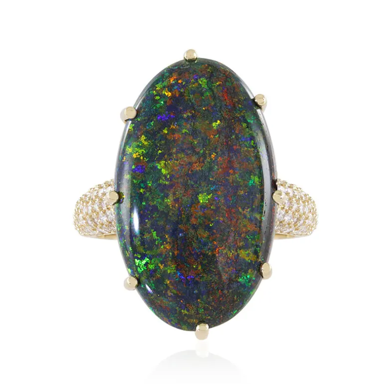 Entdecken Sie das bezaubernde Farbenspiel dieses 12,5 ct. Australischen Andamooka Matrix Opals in einem luxuriösen Ring aus 585er Gelbgold. Gekrönt von einem schillernden ovalen Cabochon, der ca. 24,2 x 14,6 mm misst, werden die leuchtenden Farben des Opals von 76 Diamanten im Brillantschliff SI1 (H) akzentuiert, die diesem Meisterwerk insgesamt 0,462 ct verleihen. Ideal für besondere Anlässe oder als opulentes Accessoire für jeden Tag, verspricht dieser Ring ein unterhaltsames Stück zu sein, das sowohl zu formellen Kleidern als auch zu schicker Geschäftskleidung passt.
