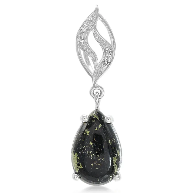 Dieser Anhänger präsentiert einen geheimnisvollen Tanz aus Licht und Schatten mit einem 3,98-karätigen Apachengold-Tropfen-Cabochon aus den USA, der zart in 925er Sterlingsilber eingefasst ist. Flankiert wird er von funkelnden weißen Topasen aus Brasilien, die dem Schmuckstück einen dezenten Schimmer verleihen. Sein einzigartiges Design macht ihn zu einer vielseitigen Ergänzung für jede Sammlung, die bei einer Party die Blicke auf sich zieht oder einen Hauch von Eleganz in Ihre Alltagskleidung bringt.