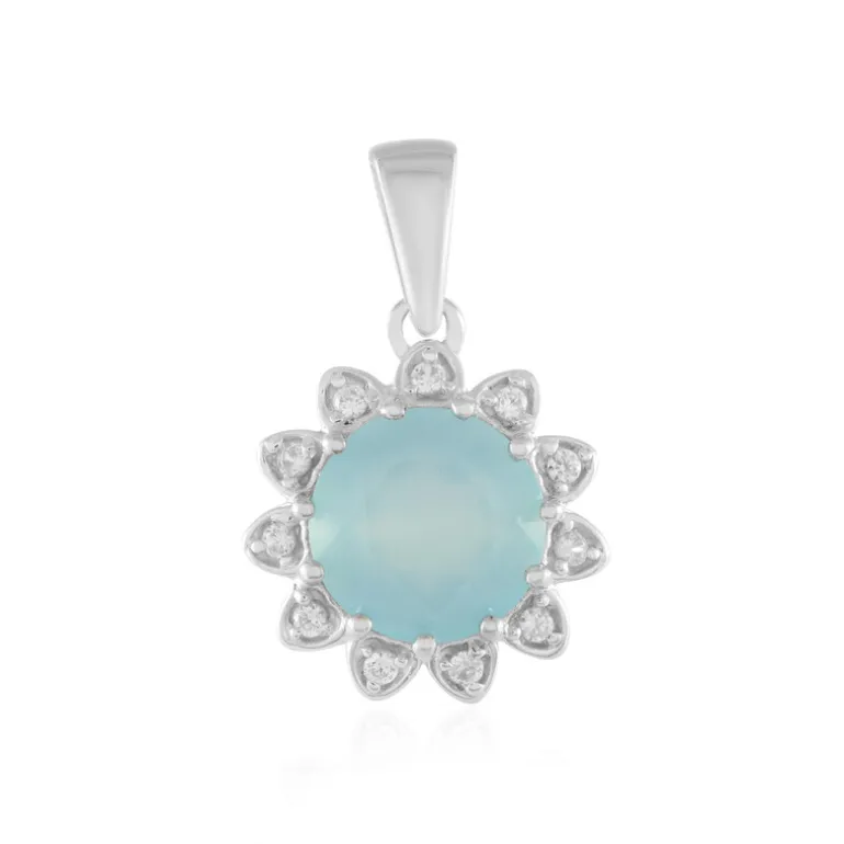 Entdecken Sie die ruhige Anziehungskraft dieses Aqua-Chalcedon-Anhängers, der mit einem rund geschliffenen Edelstein aus Indien wunderschön gestaltet ist. Akzentuiert durch schimmernde kambodschanische Zirkone, strahlt das Stück in plattiertem 925er Sterling Silber Eleganz aus. Mit einem Gesamtkaratgewicht von 1,593 ct verleiht er jedem Outfit einen Hauch von Raffinesse. Perfekt sowohl für legere Ausflüge als auch für elegante Soirees.