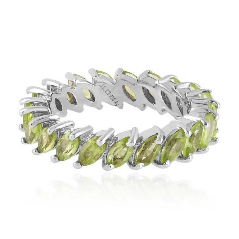 Entdecken Sie die bezaubernde Anziehungskraft dieses Rings aus Sterlingsilber, der die leuchtenden Grüntöne der Arizona-Peridot-Steine zur Geltung bringt. Jeder einzelne Peridot im Marquiseschliff wird von einer eleganten Silberfassung gehalten und bildet ein durchgehendes Band, das den Finger elegant umschließt. Dieser Ring ist ein vielseitiges Schmuckstück, das sich sowohl als Farbtupfer im Alltag als auch zur Ergänzung eines schicken Abendoutfits eignet. Lassen Sie sich von der Schönheit der Natur verzaubern mit diesem Edelsteinring, der für zeitlosen Stil und Raffinesse steht.