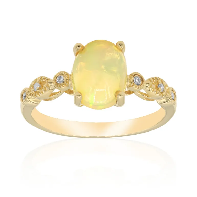 Entdecken Sie die Eleganz dieses atemberaubenden Rings mit australischem Opal aus 10 Karat Gelbgold. Der fesselnde ovale Cabochon-Opal von 0,96 Karat wird von sechs Diamanten im Brillantschliff SI1 von insgesamt 0,05 Karat wunderschön akzentuiert. Das leuchtende Design dieses Rings eignet sich sowohl für zwanglose als auch für formelle Anlässe und passt perfekt zur Abendgarderobe oder zu einem eleganten Tageslook.